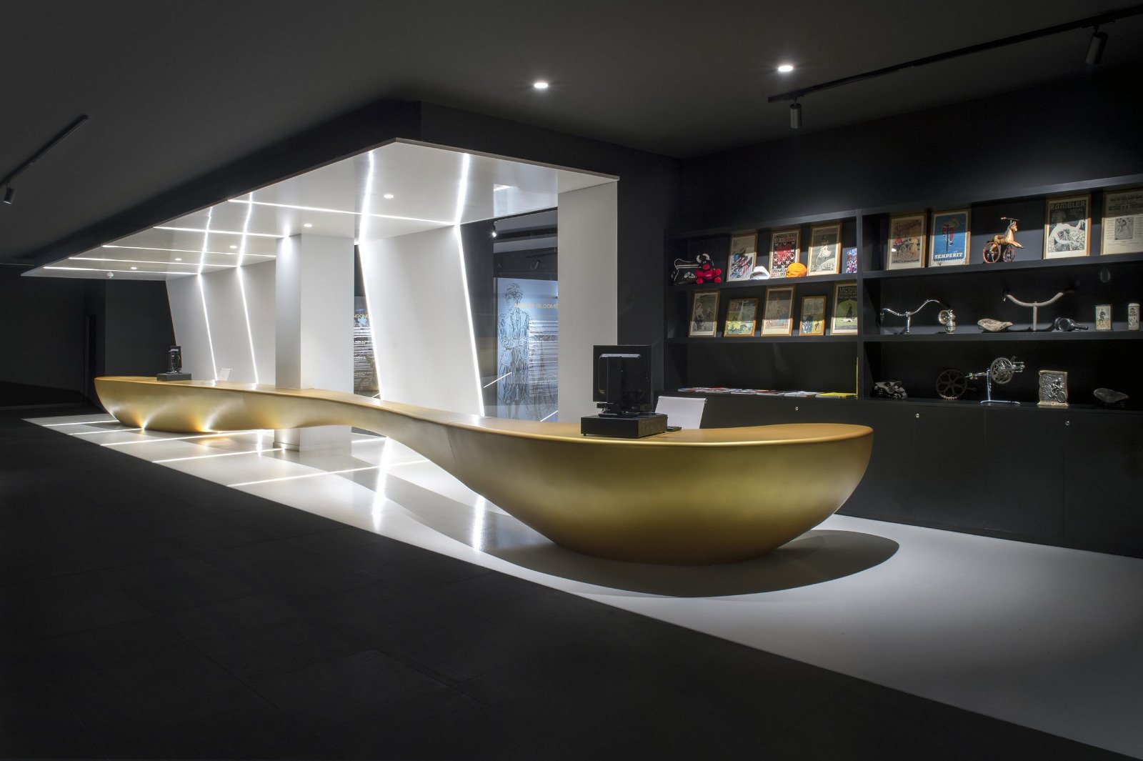 En este proyecto desarrollamos el mostrador principal del espacio BiciLab, una pieza escultórica realizada en fibra de vidrio de alto rendimiento. Este material fue seleccionado por su gran resistencia, versatilidad formal y durabilidad en entornos de uso intensivo. El diseño orgánico y fluido del mostrador se integra armónicamente con el lenguaje contemporáneo del museo, sirviendo como punto de acogida y referencia para los visitantes. El resultado es una pieza única que combina estética, funcionalidad y tecnología aplicada al diseño espacial.