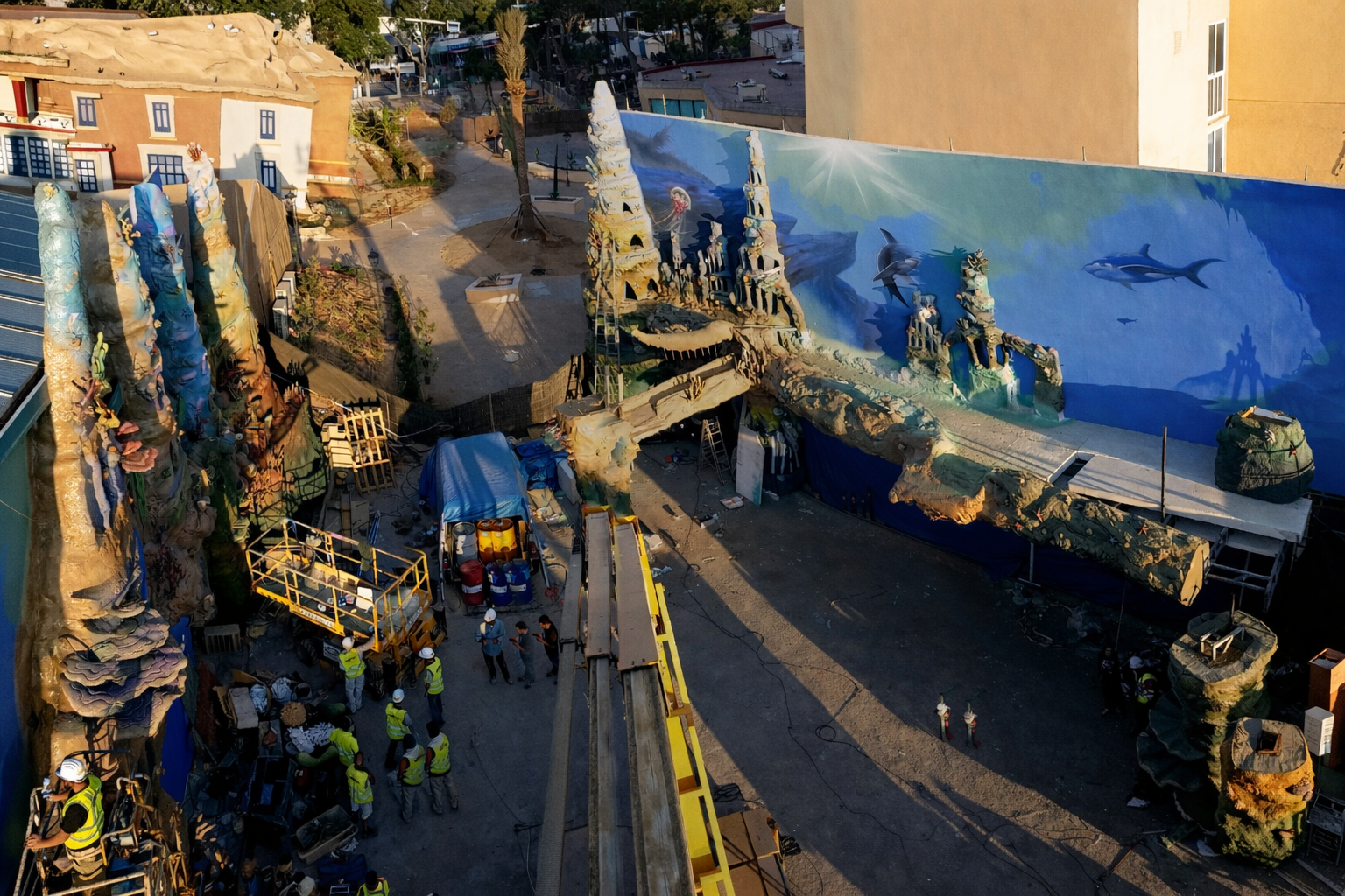 Fabricación y revestimiento de escenografías, decorados y estructuras tematizadas. Protección integral de superficies expuestas a impactos, agua y fricción mediante sistemas impermeables y de fácil mantenimiento, preparados para uso intensivo.